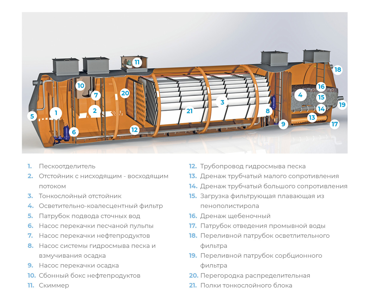 Сорбционный фильтр - отфильтрованная сточная вода поступает в сорбционный фильтр, где происходит доочистка до уровня норм допустимого сброса загрязняющих веществ в водоем. Сорбционный фильтр (сорбция, от латинского sorbeo — «поглощаю») обладает высокой степенью очистки от остаточных растворённых нефтепродуктов и мельчайших механических примесей. По дну сорбционного фильтра проложен дренажный трубопровод. Нижняя часть фильтра заполнена сорбентом: активированным углем на щебеночной подложке, позволяющей доводить степень очистки до требований к сбросу в водоемы рыбохозяйственного назначения. Уголь позволяет задерживать такие вредные примеси, как бензолы, соединения хлора, фенолы, радионуклиды, частицы тяжелых металлов и т. д.